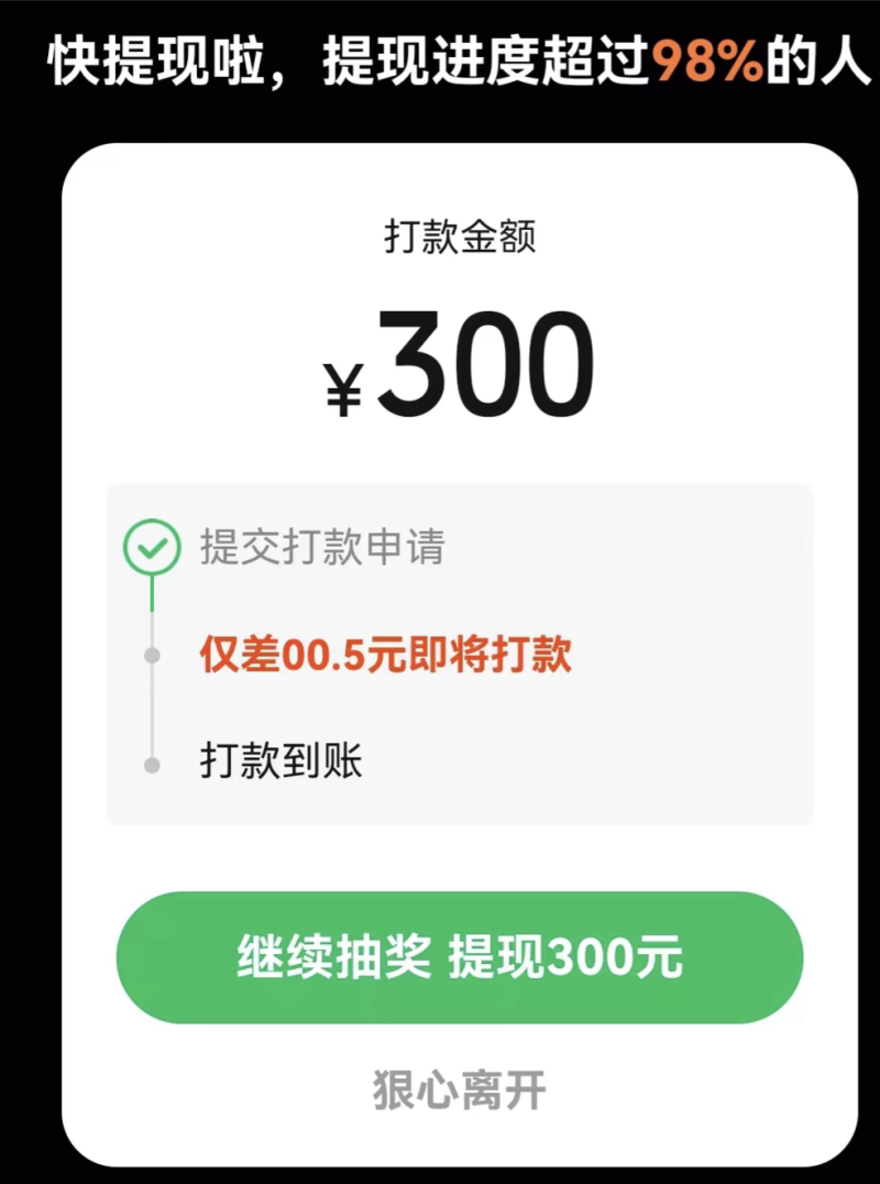 想要离开也没那么容易,拼多多会尽职尽责的挽留你:“快提现啦,不要放弃呀!”但买的不如卖的精,想要提现难如登天。